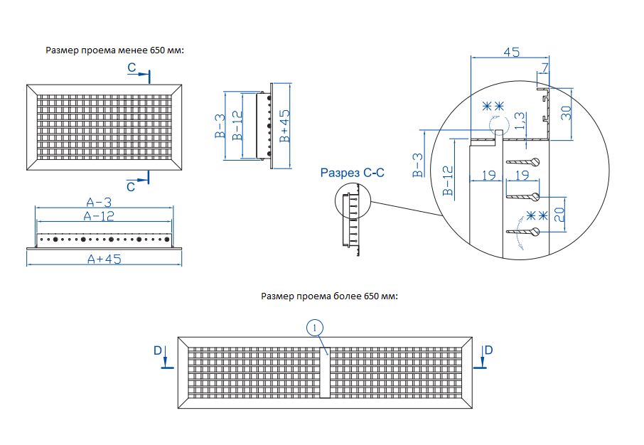 Для избежания провисания жалюзи на решетки шириной проема более 650 мм вертикально устанавливается швеллер.